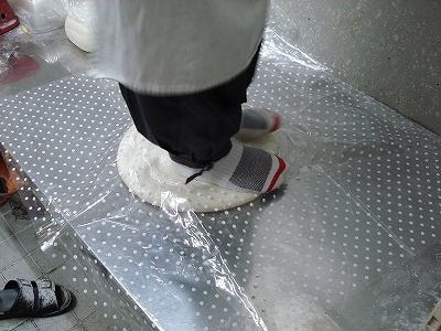 ⑪丸めた生地を足踏みし平らにする