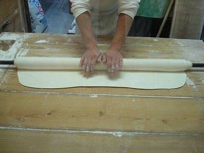 ⑬平らにした生地を麺棒でのばす。