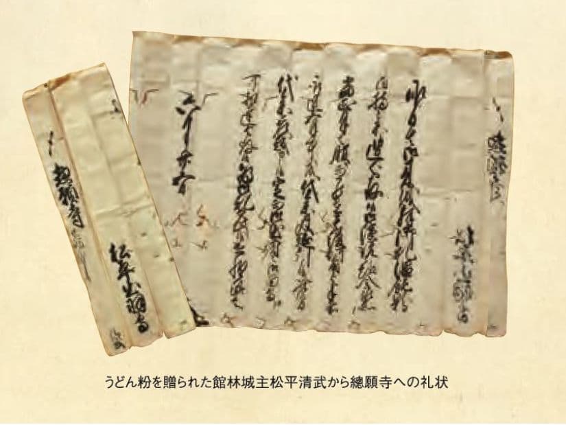 関東三大不動に数えられる、市内の古刹、不動ヶ岡不動尊總 願寺には、加須名物の『温範粉』を贈られた館林城主からの礼 状が残されています。この古文書には、作成年が書かれてありま せんが城主である松平清武の生没年や總願寺との結びつきなど を詳しく分析した結果、加須うどんの歴史は300年以上にまでさ かのぼることが分かりました。 <さきたま文庫59「玉壽山 總願寺」より>